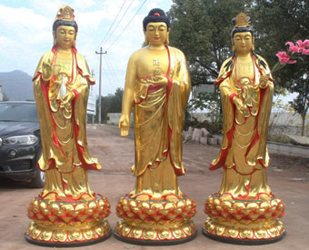 我們經常可以在寺廟里見到西方三圣銅佛像雕塑,包括阿彌陀佛、觀世音菩薩和大勢至菩薩,阿彌陀佛是表無量光明,無量的壽命,無量的功德。觀音菩薩是表大慈悲,宇宙的大慈悲。大勢至菩薩是代表喜舍。